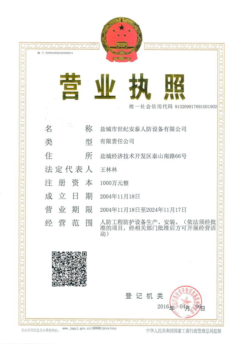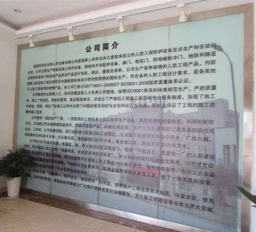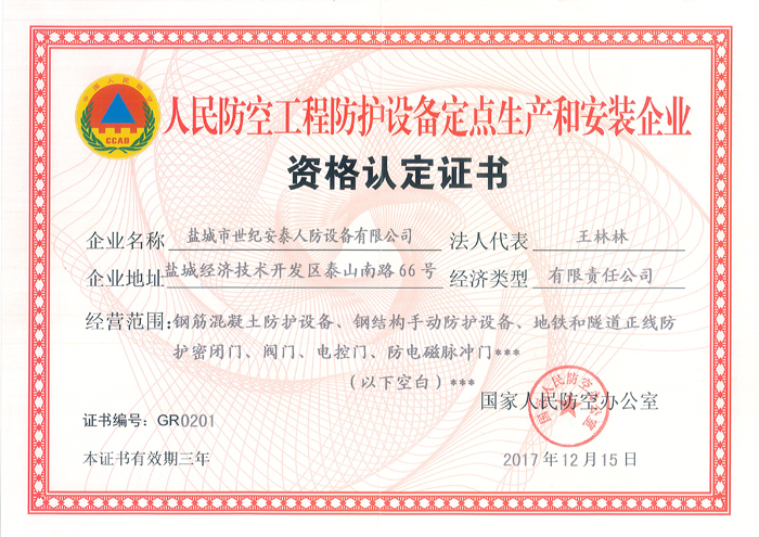 鹽城市世紀(jì)安泰人防設(shè)備有限公司是國家人民防空辦公室批準(zhǔn)成立的人防工程防護(hù)設(shè)備定點(diǎn)生產(chǎn)和安裝企業(yè),是專業(yè)生產(chǎn)、銷售、安裝人防防護(hù)設(shè)備產(chǎn)品的企業(yè),公司主要生產(chǎn)鋼筋混凝土防護(hù)設(shè)備、鋼結(jié)構(gòu)手動(dòng)防護(hù)設(shè)備、閥門、電控門、防電磁脈沖門、地鐵和隧道正線防護(hù)密閉門等各類產(chǎn)品并對(duì)產(chǎn)品進(jìn)行安裝、調(diào)試、維修及保養(yǎng),公司生產(chǎn)的各種規(guī)格的人防工程產(chǎn)品,均按國家人防總參工程兵四所及中國建筑標(biāo)準(zhǔn)設(shè)計(jì)研究院提供的圖紙生產(chǎn),符合各種人防工程設(shè)計(jì)要求,是各類地下人防工程選用的理想產(chǎn)品。本公司已通過GB/T19001-2008IDT ISO9001:2008國家質(zhì)量體系認(rèn)證。